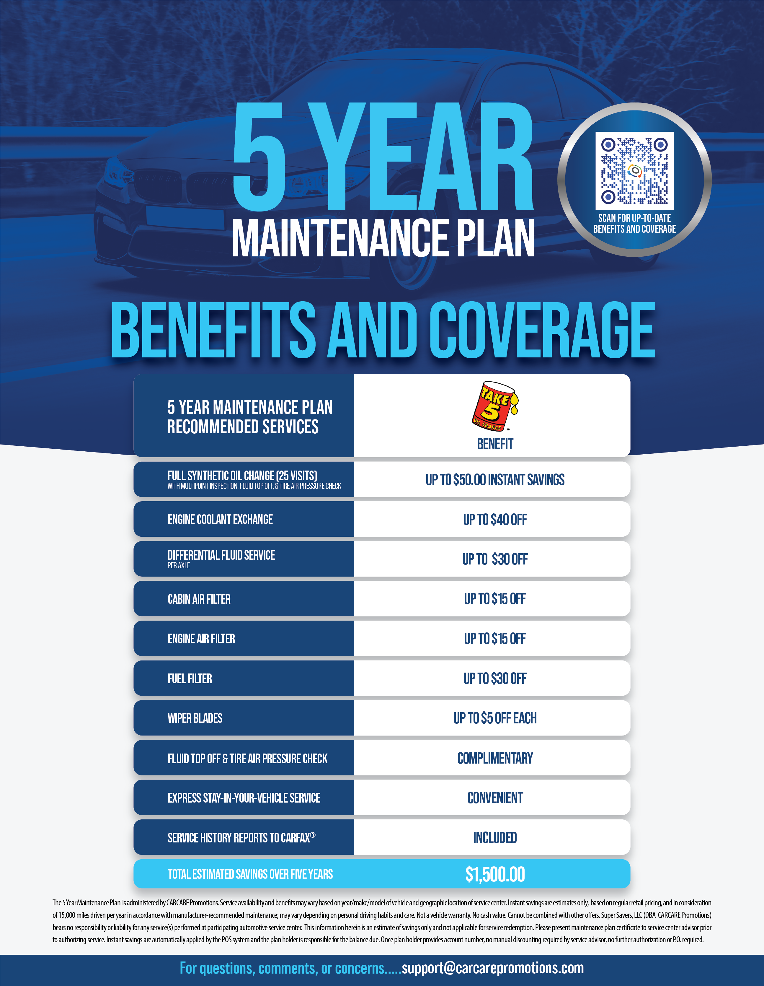 Adobe Auto Sales vehicles now qualify for a 5 Year Maintenance Plan (see salesperson for details). The 5 Year Maintenance Plan includes significant savings on maintenance not covered by a warranty, such as oil changes, windshield wipers, engine air filters, and cabin air filters at any Take 5 Oil Change nationwide.